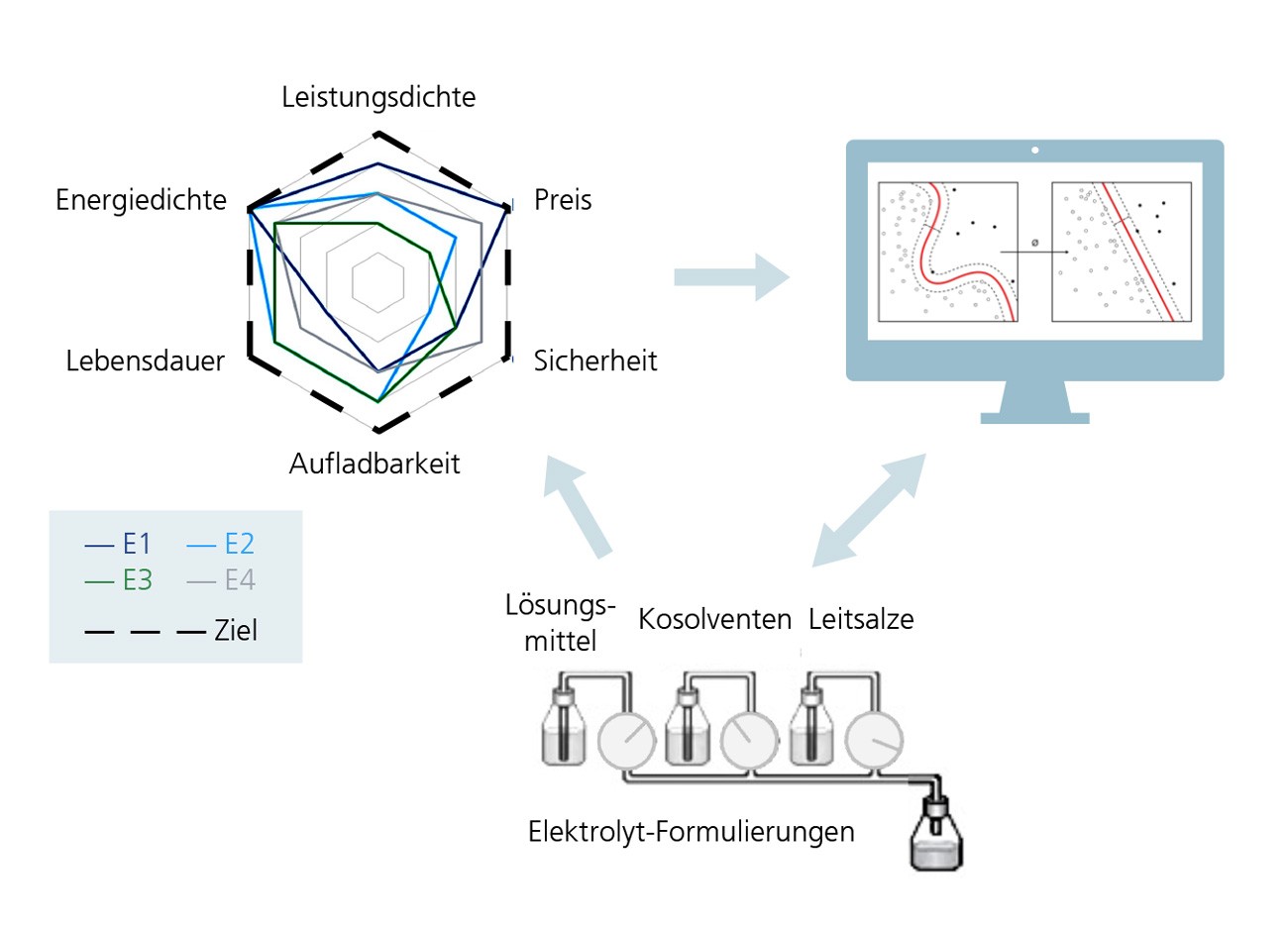 Das Elektrolyt ist das zentrale Bindeglied in einer Batterie: Es ermöglicht den Ionenfluss zwischen den Elektroden und bestimmt damit Leistung, Stabilität, Sicherheit und Lebensdauer des Energiespeichers. Schon kleine Änderungen in der Zusammensetzung des Elektrolyts oder den physikalisch-chemischen Eigenschaften können erhebliche Auswirkungen auf die Batteriefunktionen haben. Neue Elektrolyte können die Leistungsfähigkeit und Lebensdauer moderner Batterien steigern, ihre Sicherheit erhöhen oder neue Batteriechemien ermöglichen. Batterien werden dadurch effizienter, langlebiger und kostengünstiger. Doch die Entwicklung neuer Elektrolyte ist komplex: In einer Batterie interagieren zahlreiche chemische Komponenten miteinander und Nebenreaktionen, die die Zellleistung beeinträchtigen, sind kaum vermeidbar. Die Vielfalt möglicher Komponenten und Reaktionspfade führt dabei zu einem nahezu unbegrenzten chemischen Raum, in dem klassische Versuch-und-Irrtum-Ansätze schnell an ihre Grenzen stoßen. Eine datengetriebene, modellgestützte Entwicklung ist daher entscheidend, um vielversprechende Formulierungen schneller zu identifizieren und gezielt zu optimieren. Um den Entwicklungsprozess zu beschleunigen, ist deshalb ein integrativer Ansatz notwendig, der experimentelle Daten und Simulationsergebnisse systematisch verknüpft, um sie für die Entwicklung neuer Elektrolyte nutzbar zu machen.